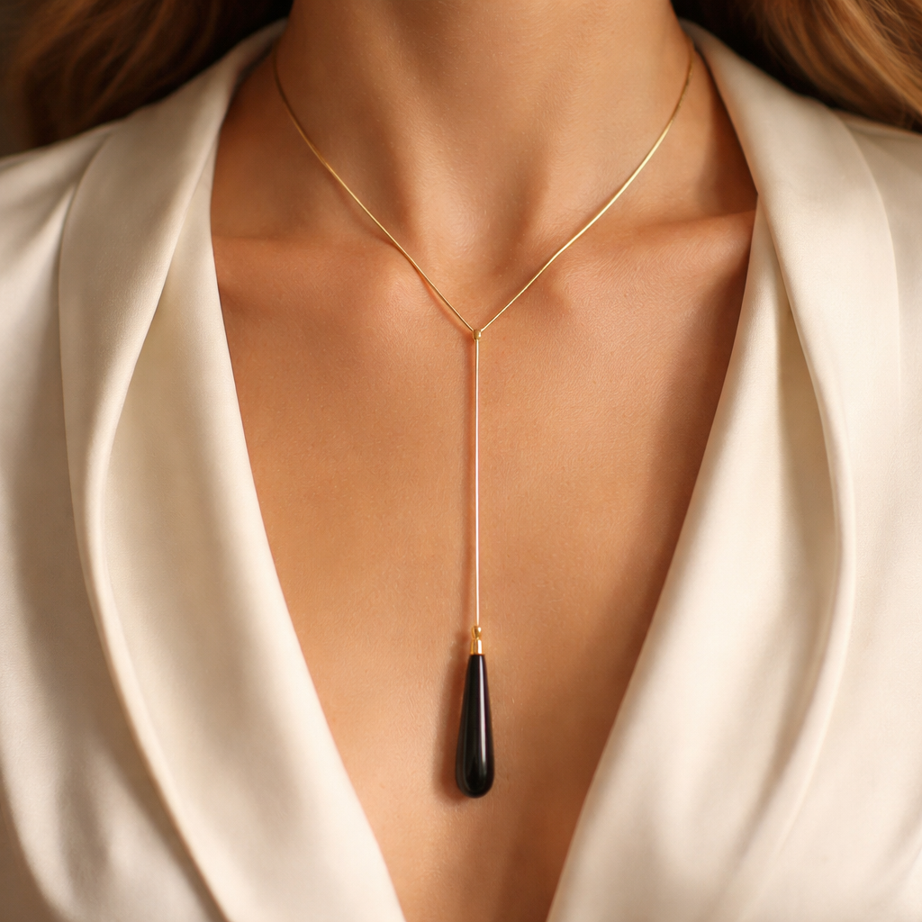 This necklace is fluid and intentional, designed to guide the eye downward in a single, uninterrupted line. A fine, high-polish gold chain rests lightly at the base of the neck before extending into a vertical drop that moves subtly with the body. At the end hangs a smooth black onyx stone, elongated or teardrop-shaped, with a mirror-like surface that absorbs light rather than reflects it. The contrast between the warm gold and deep black creates instant drama. The piece feels sensual and deliberate — understated from the front, striking from every angle. It draws attention naturally, without needing size or excess. Luxury cue: negative space, movement, restraint.