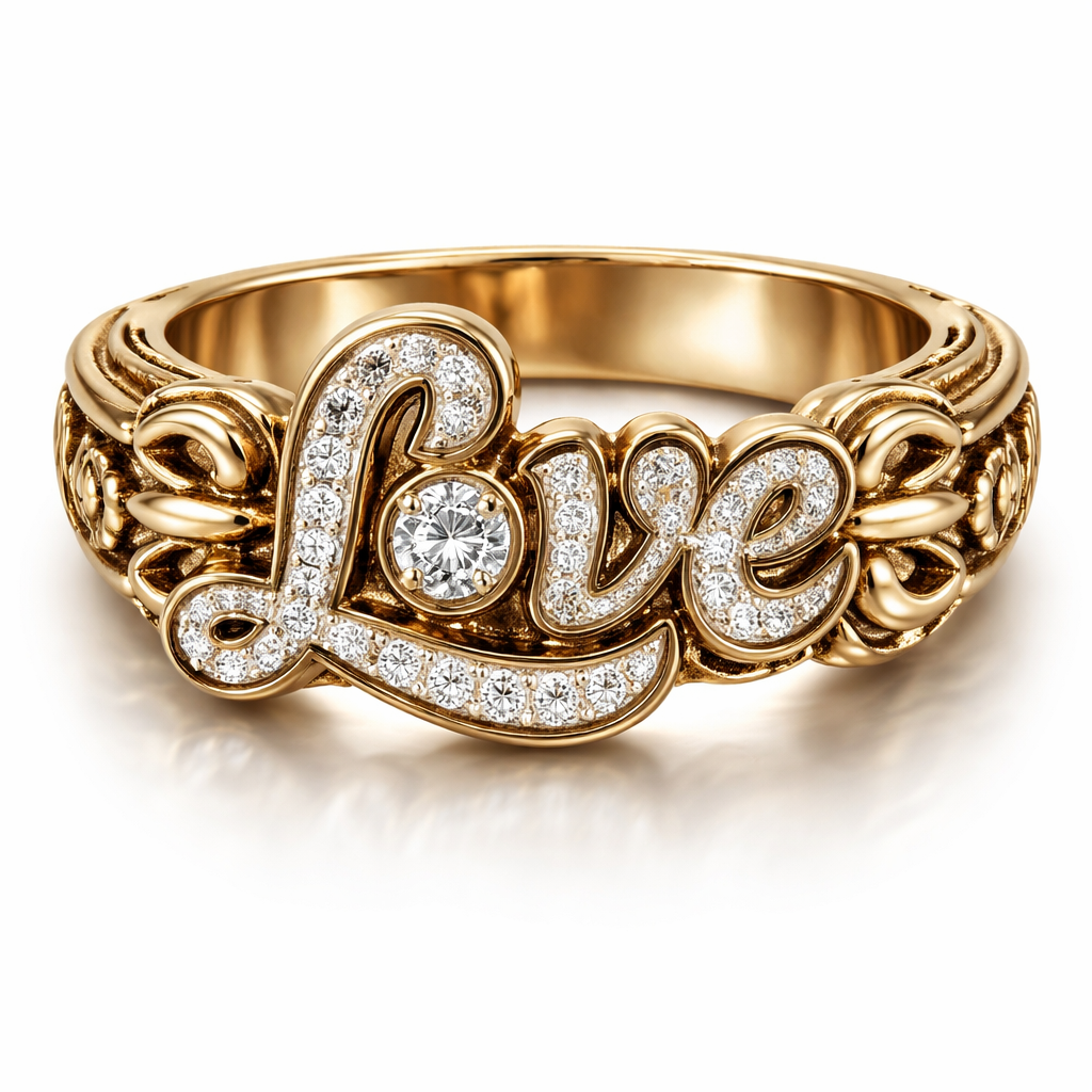 I would like the ring to have a thick band. The word love is a fancy bubble text with only 2 diamonds and the band to attach from the sides with loops, vintage style