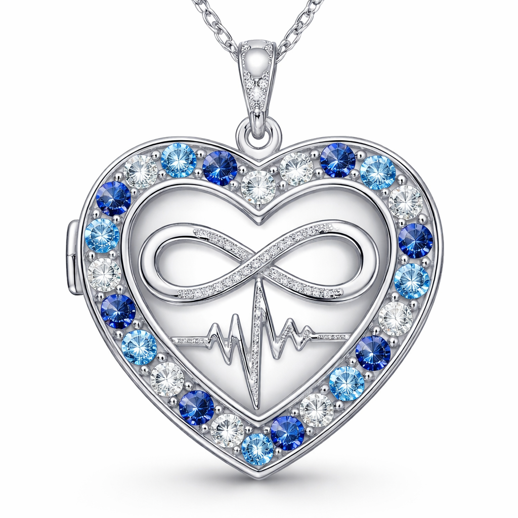 A heart necklace with the infinity symbol and heartbeat wave with alternating March, September and December birthstones all the way around the heart and infinity symbol, locket style