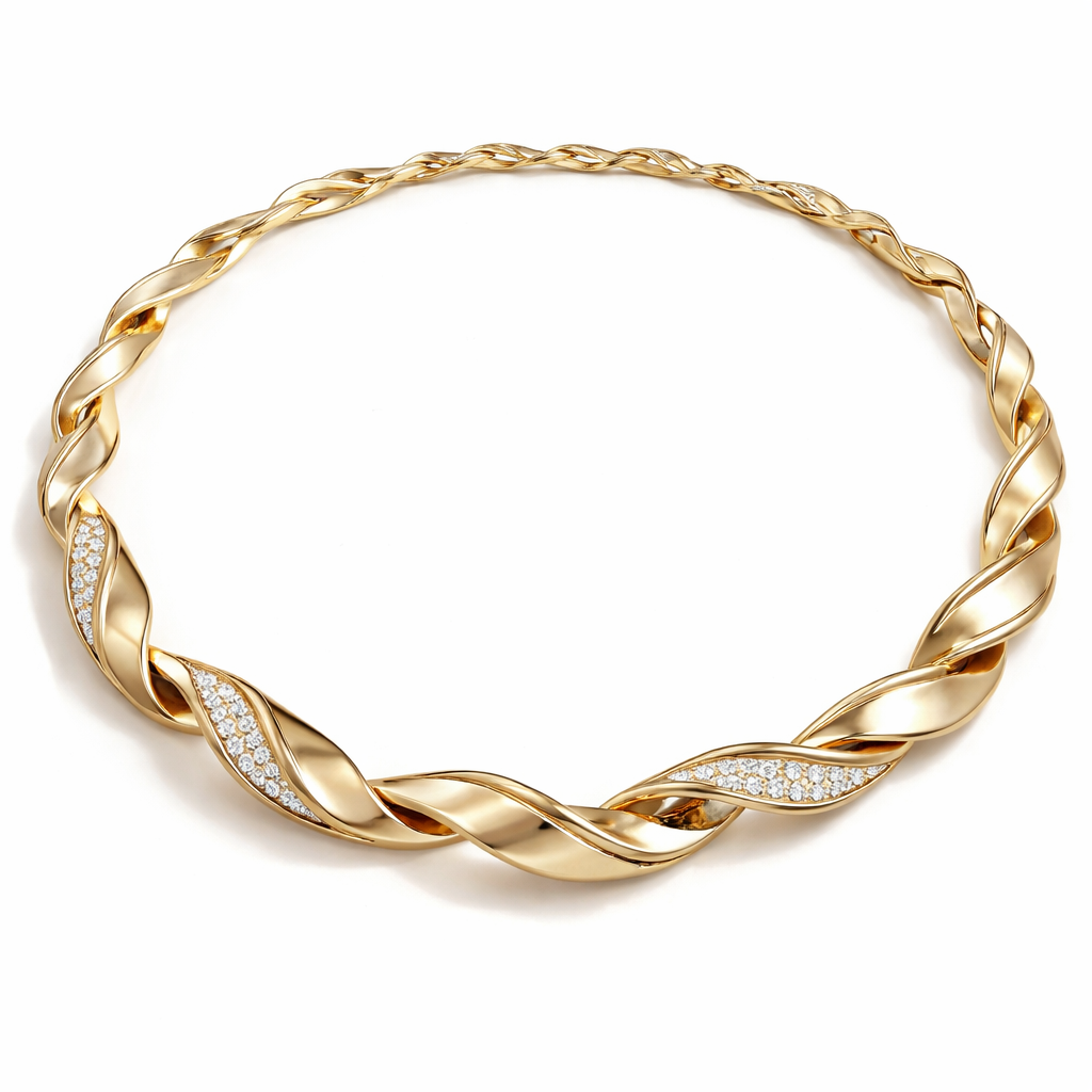 A light weight necklace that has links and articulations and makes it flexible that inspired by one twisted flat wire and its light weight and has diamond and gold, modern style