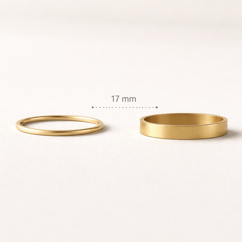 Fais une alliance en fil carré fine , laisse un espace puis fais une alliance en fil rectangle de 2 fois la dimension du fil carré celle si mat en or jaune taille 58 met les droite l’une a côté de l’autre avec un espace de 17 mm entre les 2