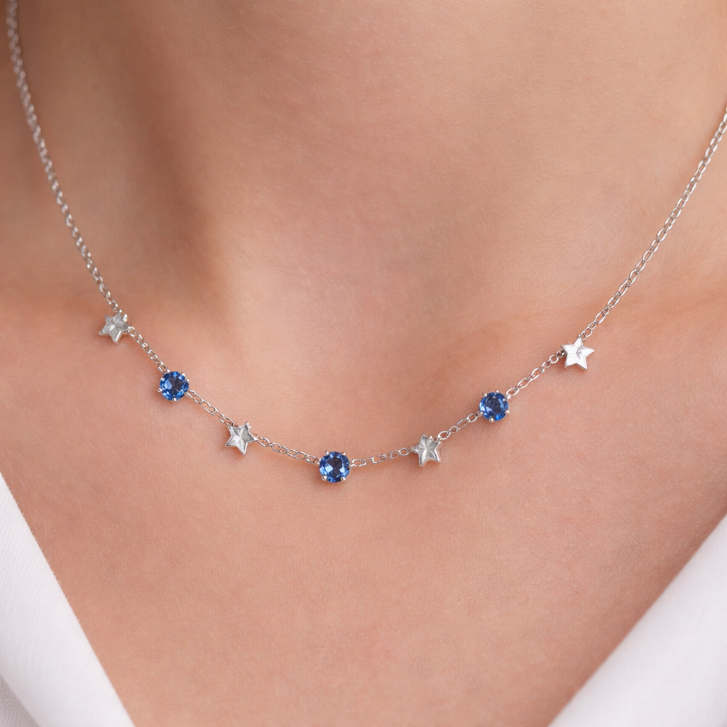 A minimalist women's necklace made of silver with sapphire stones suitable for daily wear. colar de estrelas com pedras azuis