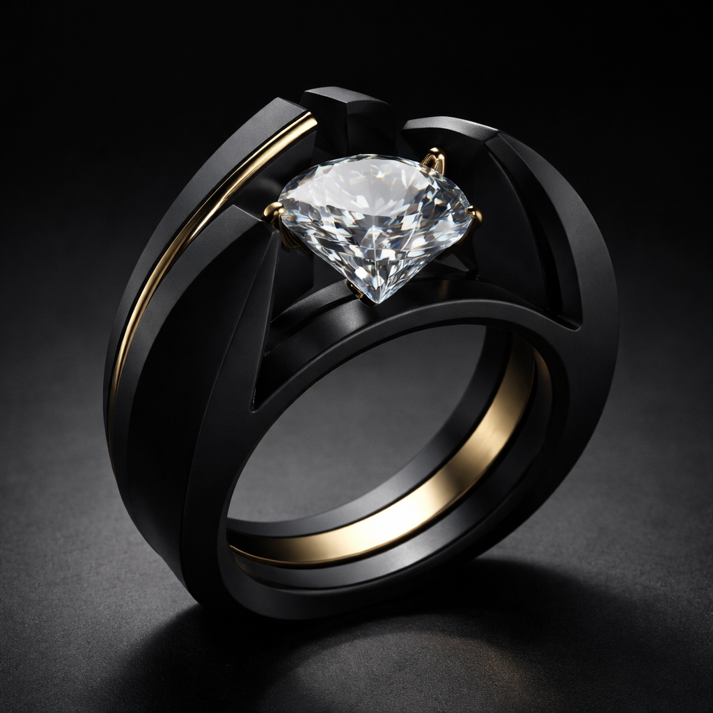 Futuristic luxury jewelry ring, black matte ceramic with large suspended lab diamond, architectural geometric design, negative space, asymmetric structure, 18k gold details, ultra high end, editorial photography, dark background, 8k