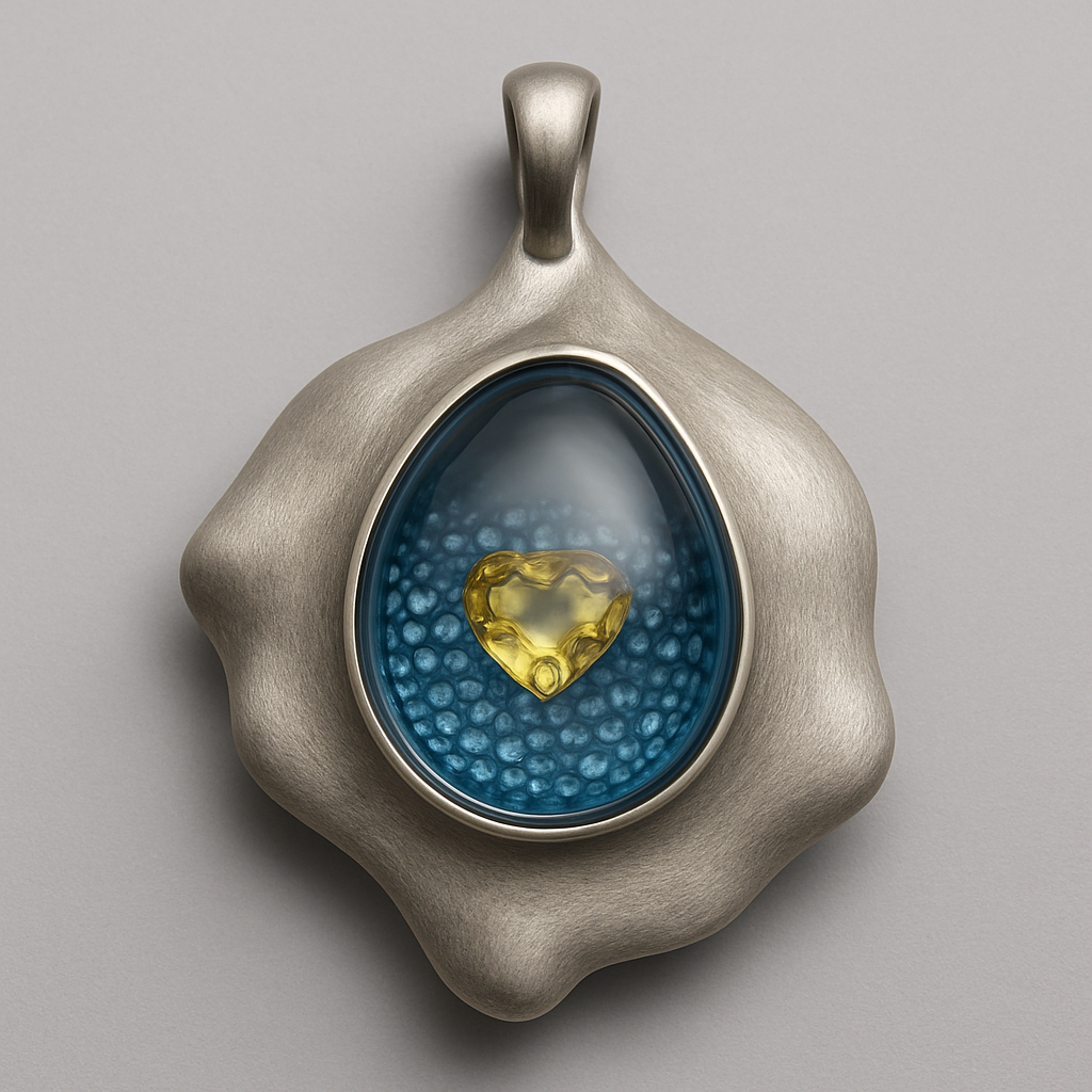 Bir mücevher tasarımı üret. amorf deniz kabuğu formunda dışa kıvrılan bir yüzeyin üzerinde damla şeklinde bir şekil olacak. Damlanın içerisinde gredyen olarak koyudan ucuna doğru açık grimsi mavide taşlar dizilecek ve ortasında kalp gibi parlayan sarı bir taş olacak. damlanın üzeri büyüteç gibi bombeli bir cam ile kapanmış olacak. bakıldığında ortasındaki sarı taşı büyütecek, contemporary style