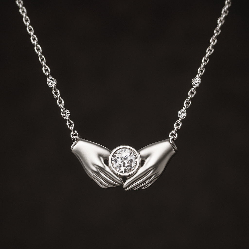 Silberne dünne Kette mit kleinen Diamenten, 2Hände die sich am kleinen Finger festhalten als Anhänger und in der Mitte in Rund gefasst ein weißer Diamant , luxury style