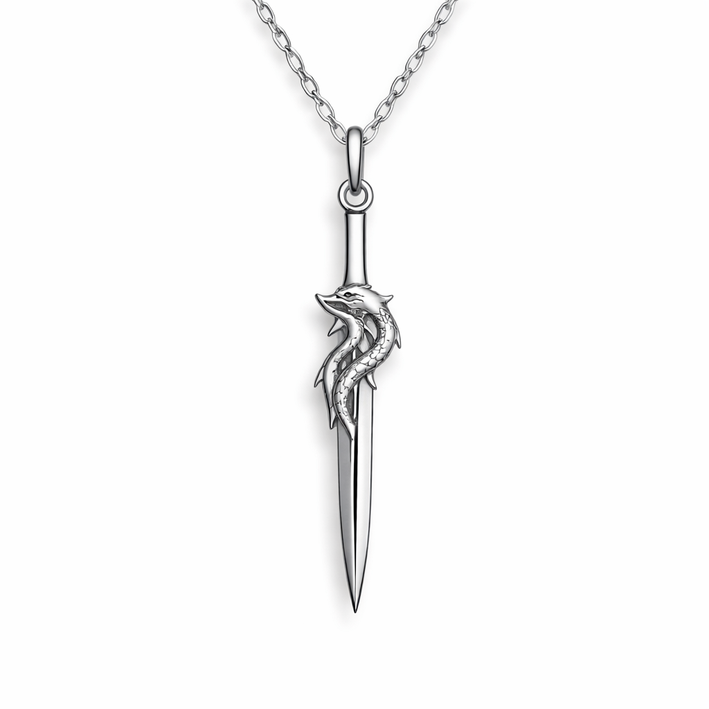 A minimalist women's pendant made of silver suitable for daily wear. pingente em formato de adaga com um dragas ao meio, minimalist style