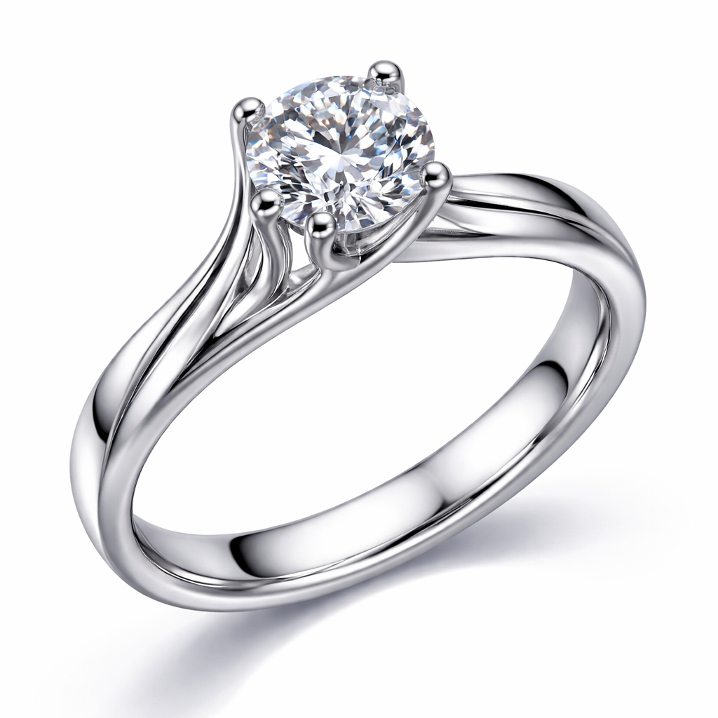 Engagement ring, double stacked tapered band, slight split shank, white gold, moval center stone