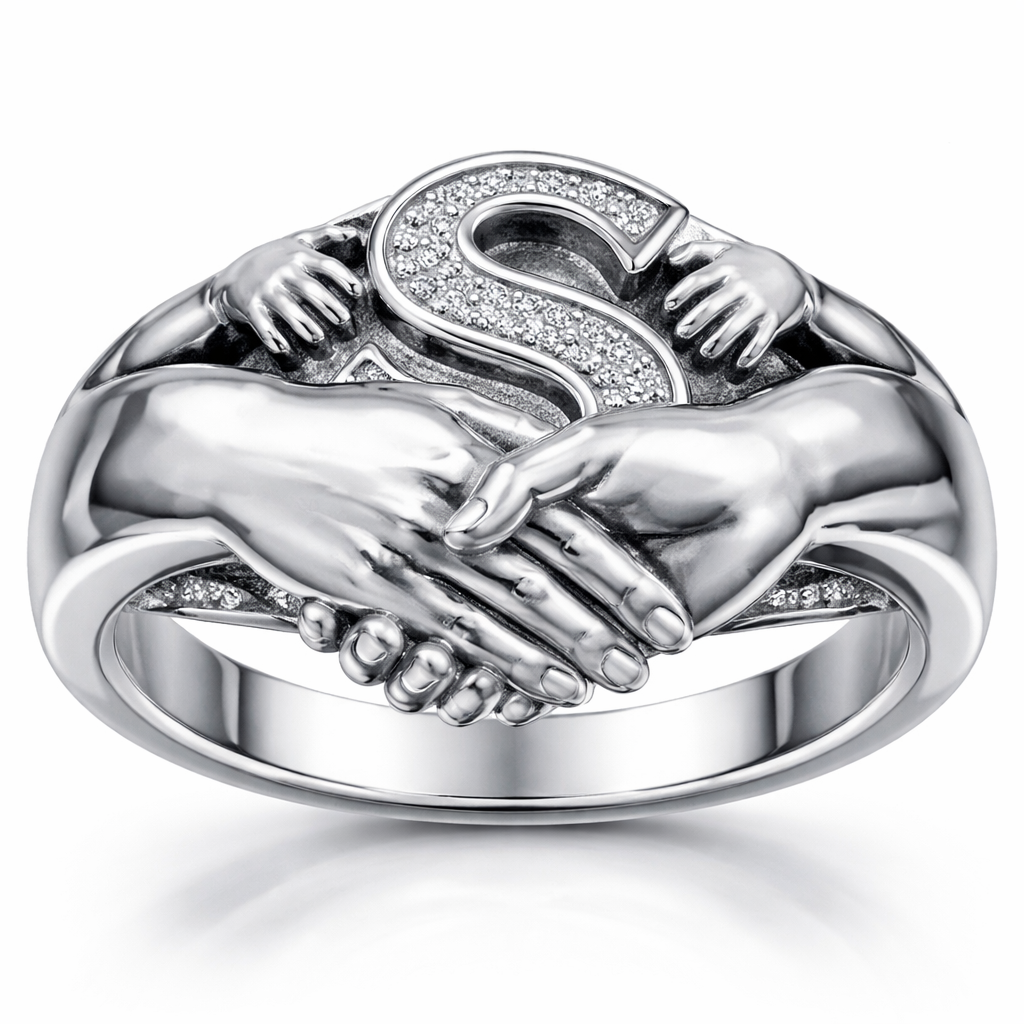 A women's ring. Anillo para hombre con una mano sujetando una mano de mujer y 2 manos pequeñas de los dedos con una letra S atras, modern style