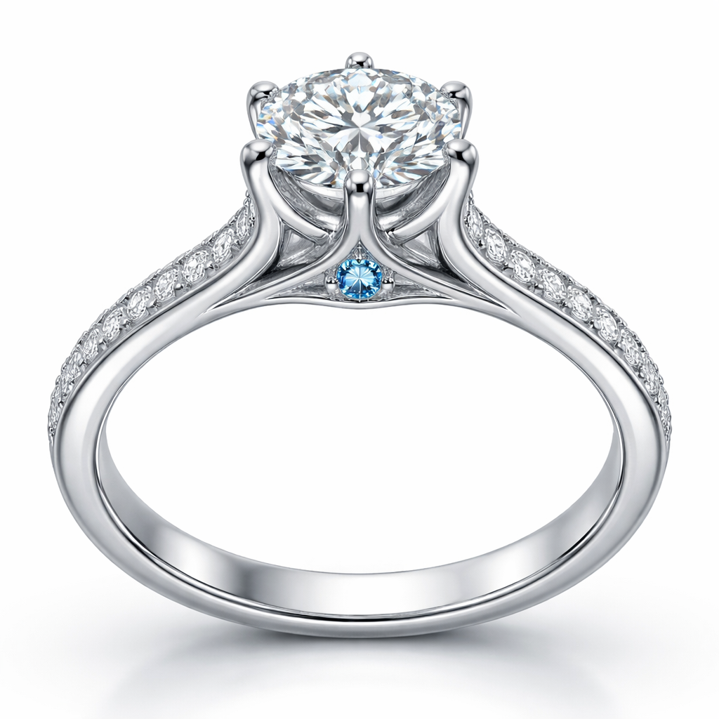 platinum, six prongs, round diamond with single row of smaller ones on the band, in a cathedral setting, guard rail, light blue sapphire single peakaboo at the base of the cathedral, no stones between the main diamond and the bridge, just the peakaboo and a single row of small diamonds on either side of it