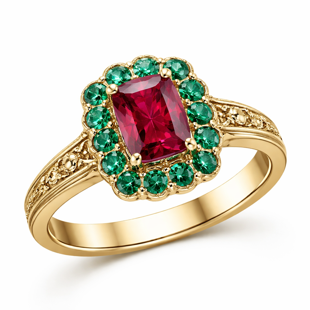 A classic women's ring made of gold with ruby and emerald stones. the ruby is a 8x6mm emerald cut, emeralds are 2mm roun...