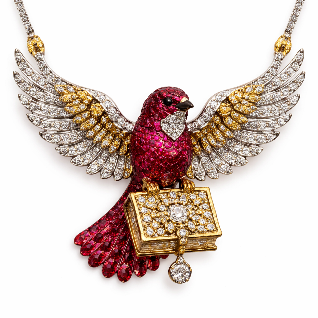 A red sparrow with the wings attached to on each side where the chain connects so the wings are open on the sparrow, and the sparrows made from rubies and diamonds, and the wings are made from silver and gold diamonds and at the bottom it’s holding a book the book is studied withstones of gold and diamonds, and that’s it for now so yeah that, royal style