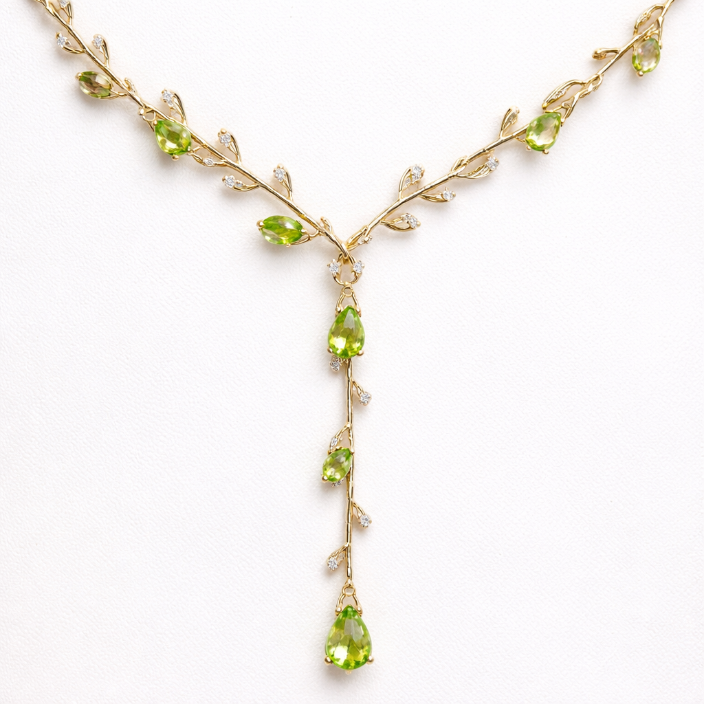 Thin Gold chain with thin wire wrapped around it like an olive branch and small pear cut bright peridot and diamond stones placed throughout the chain with a lariat.