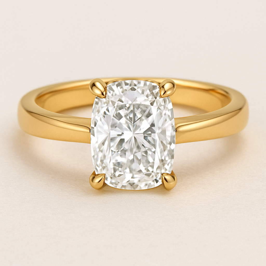 Elongated cushion cut diamond two carrots set in a yellow gold setting wide taper band with talon prongs