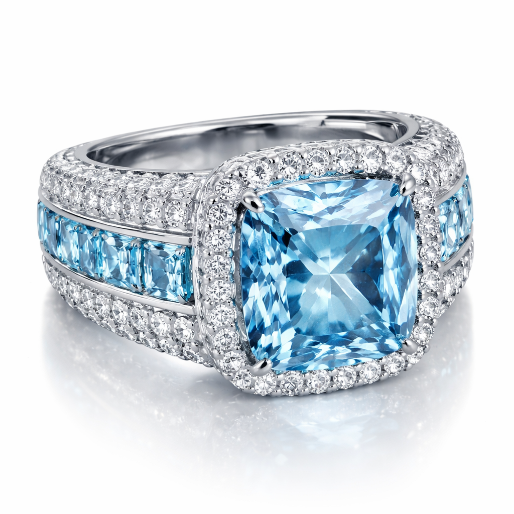 Diamond ring with thick band with diamonds and aquamarine