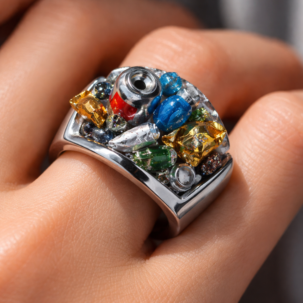 A women's ring. "Jewelry design of a ring, sculpted biomechanical creature face, tentacle-like veins, melting skin textu...