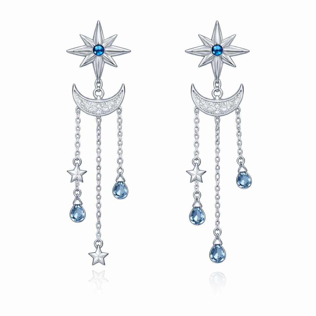 A minimalist women's earrings made of silver with sapphire stones. brinco com uma estrela de 8 pontas central e uma meia lua embaixo. três correntes são ligadas a estrela principal com estrelas e pedras azuis penduradas. estrelas e pedras pequenas, minimalist style