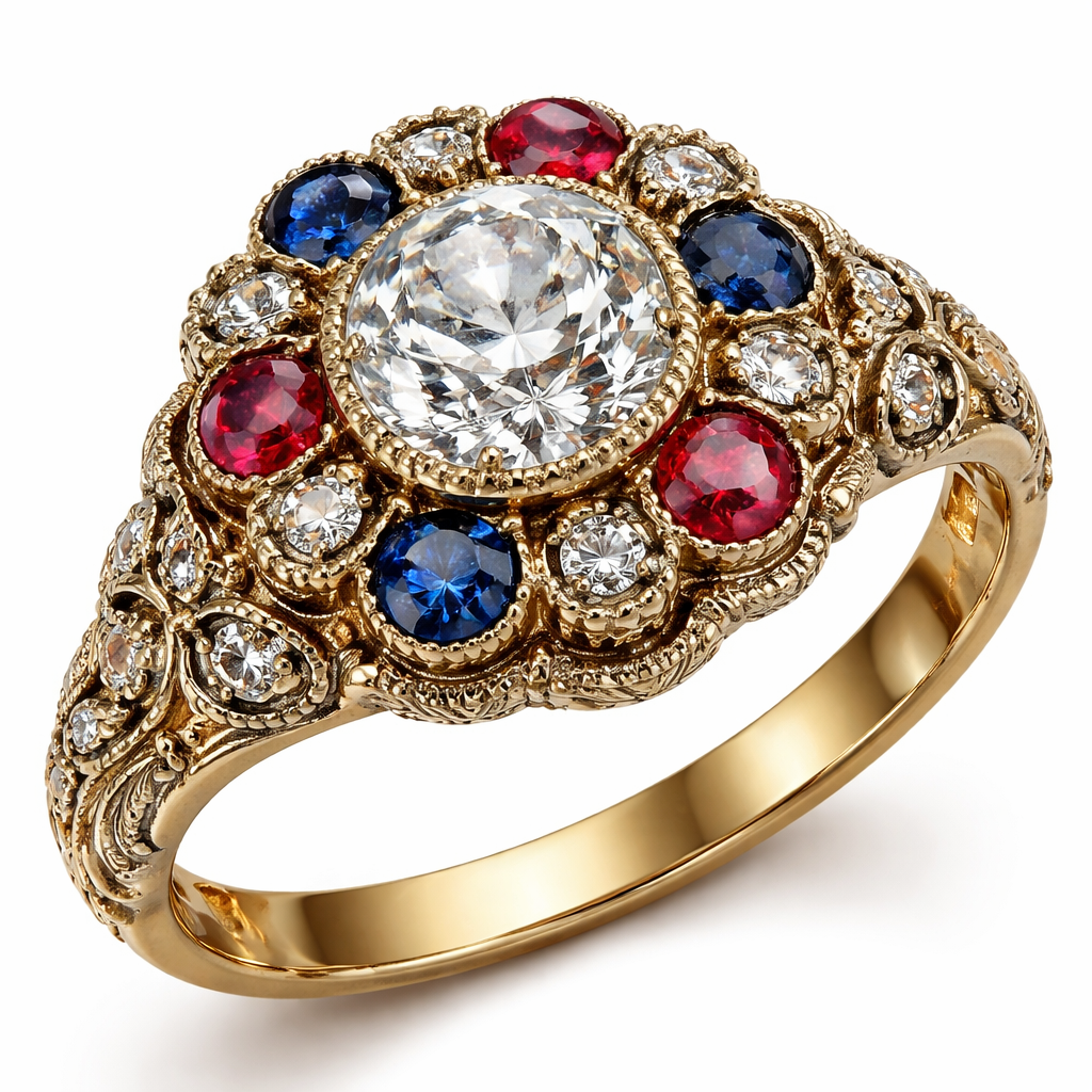 A old mine diamond ring with rubies and sapphires , victorian style