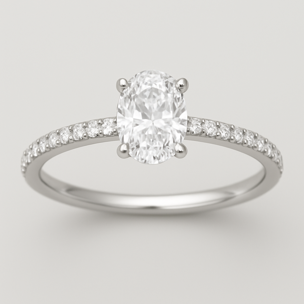 Minimalist jewelry: Platinum solitaire ring, 9x6mm oval diamond. Thin platinum band, 25 small round diamonds in claw setting.