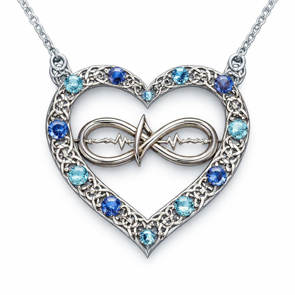 A heart necklace with the infinity symbol and heartbeat wave with alternating March, September and December birthstones all the way around the heart and infinity symbol, celtic style