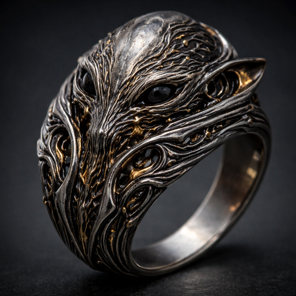 A women's ring. "Jewelry design of a ring, sculpted biomechanical creature face, tentacle-like veins, melting skin texture, alien ear shape, dark silver and gold metal, surreal horror art, 3d render, high quality jewelry", modern style