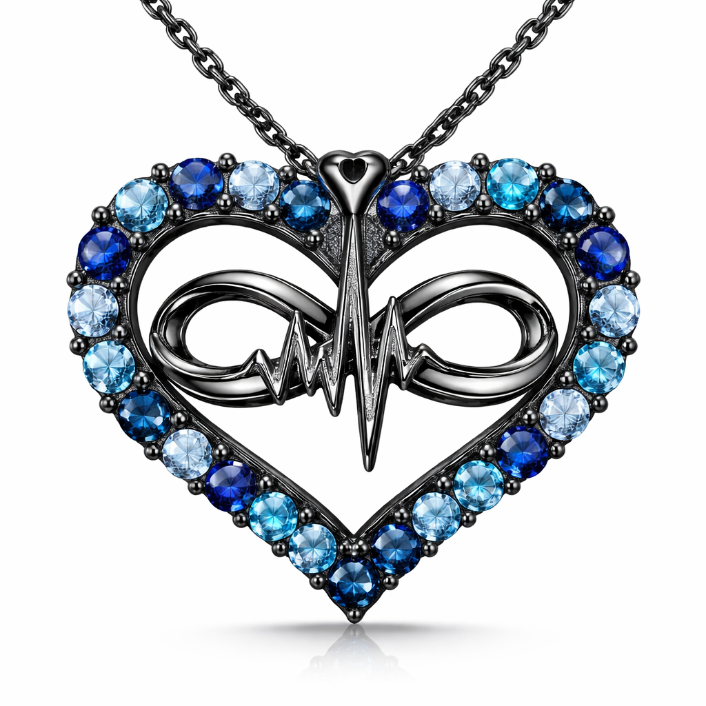 A heart necklace with the infinity symbol and heartbeat wave with alternating September, December and March birthstones all the way around the heart and infinity symbol, gothic style