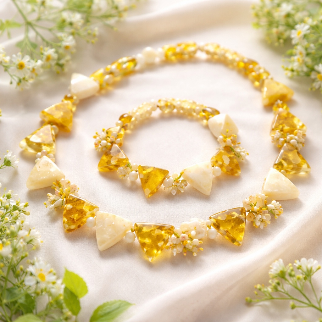Tik gintaro karolis ir apyrake moteriai, geltona balta su idomiu dizainu be metalu pavasarines nuotaikos trikampio forma, romantic style