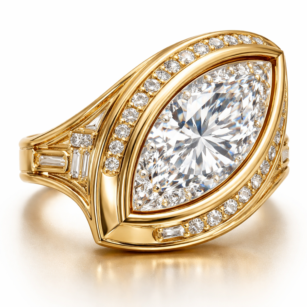 Marquise 3 carat lab diamond with thick 0.4 cm layer of gold around it like a frame and curved (diamond is on the side , art_deco style