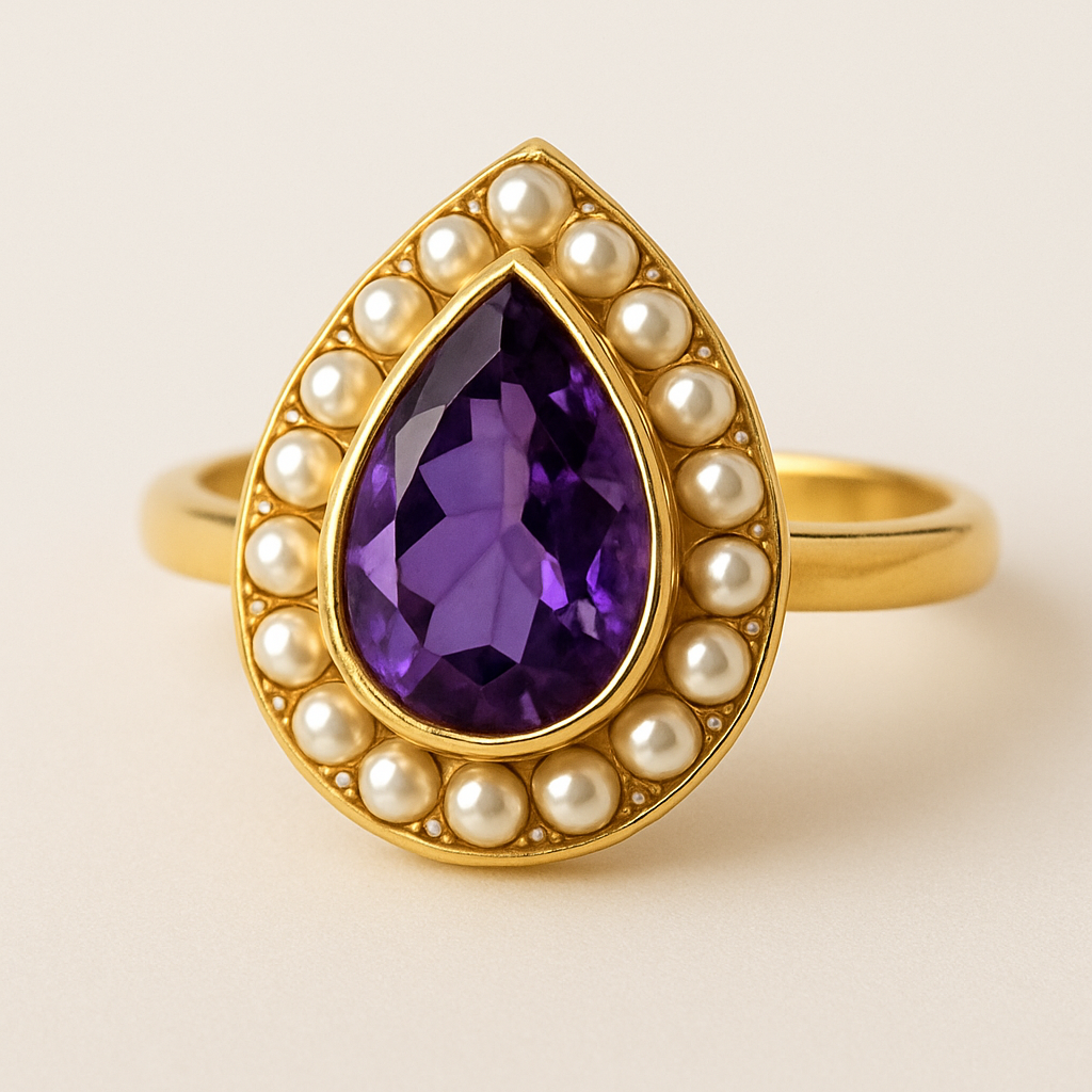 Gold plated brass, single stone pear shaped amethyst set with small pearls