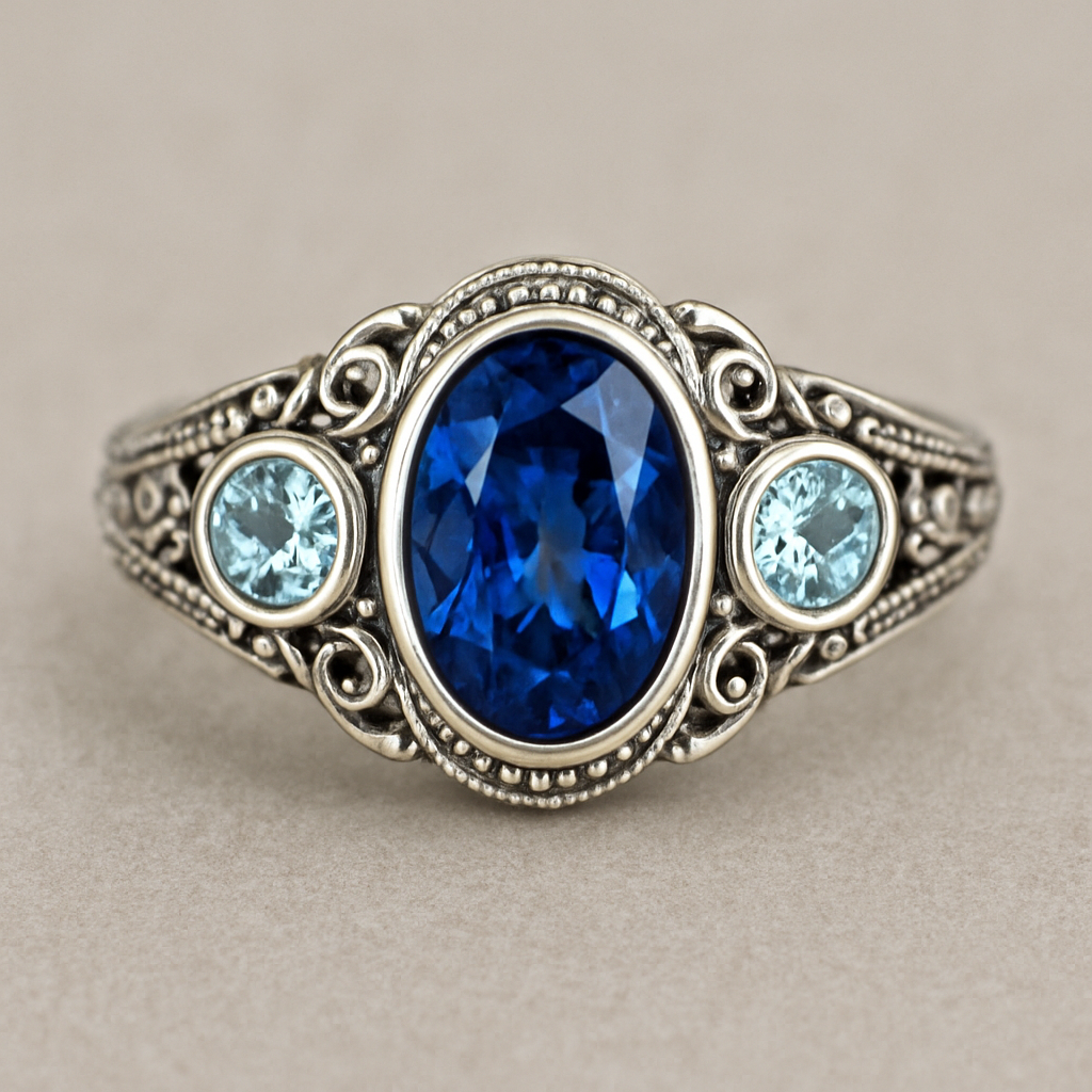 Oval sapphire silver ring with round aqua topaz accent stones , vintage style