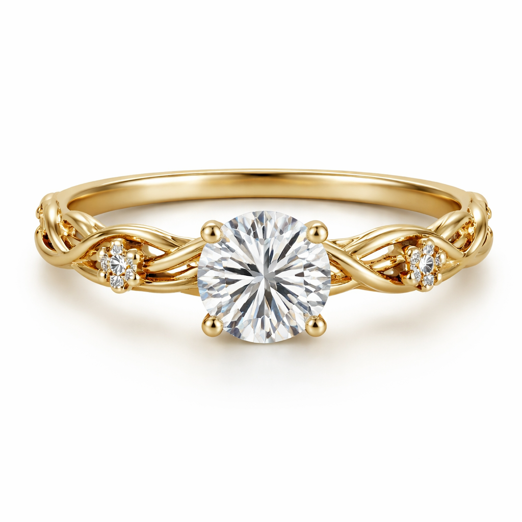 I want an intertwined vine band with VERY small flowers with diamonds in the flowers (they are not the focal point), maybe 1-2 flowers on each side of the band and then one large diamond in the middle, you will not see the vines next to the large diamond in the middle only on the band , it’s an engagement ring. I want yellow gold.