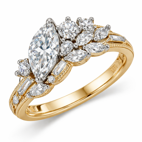 Create a ring in 14k yellow gold, set in platinum. The center stone is a .60 size marquise diamond with a .25 round diam...