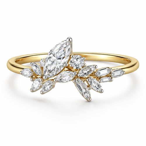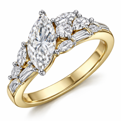 Asymmetrical diamond ring design with 1 .6 marquise , 1 .25 round , 6 smaller marquise, 2 .15 round and 4 .1 baguettes o...