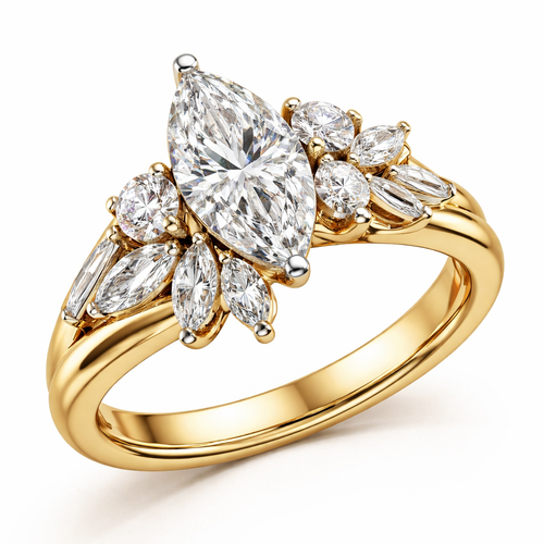 Create ring design with 5mm Wide yellow gold band use a .6 marquise diamond and .25 round diamond and 6 smaller marquise...