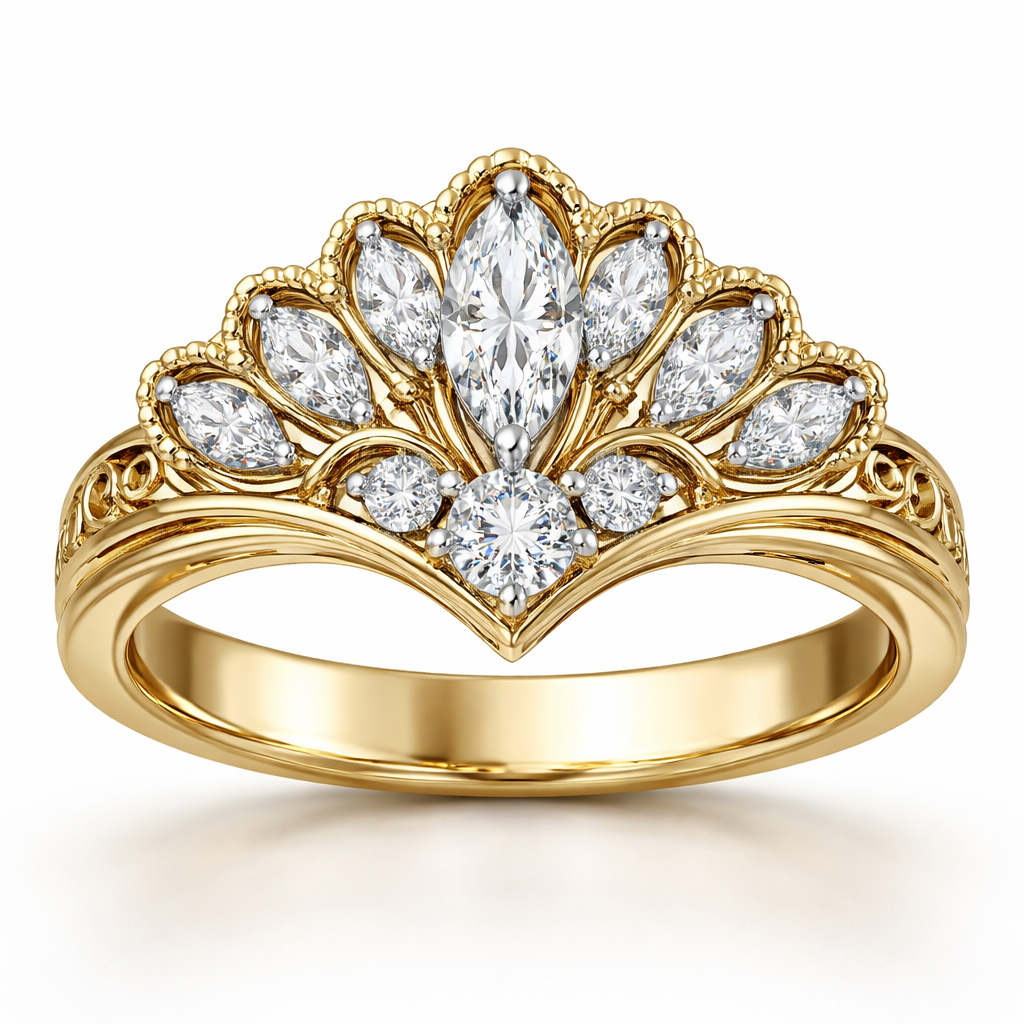 .6 karat marquise centered, with .25 round directly under it with 6 more smaller marquise diamonds and 2 .15 round diamonds mounted on a wide 14k yellow gold band. Make the design in a fan shape and use platinum prongs, filigree style