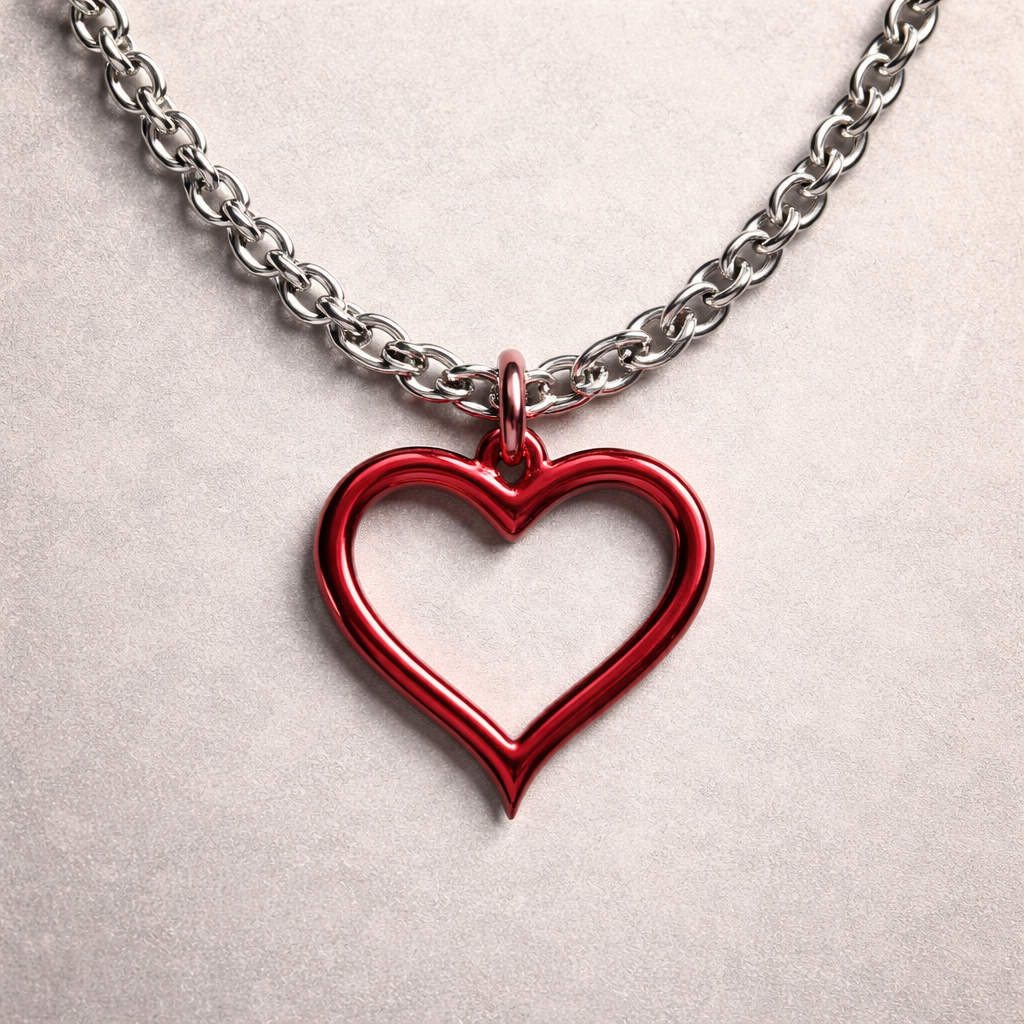 color : silver design : a heavy chain not super thick, a 2 millimetre thickness, that’s for the loops and for the main piece i want a red metal heart, hollow, only the outline, with a sharp edge from ghe bottom and a bold red steel no crystals no shimmer just the steel