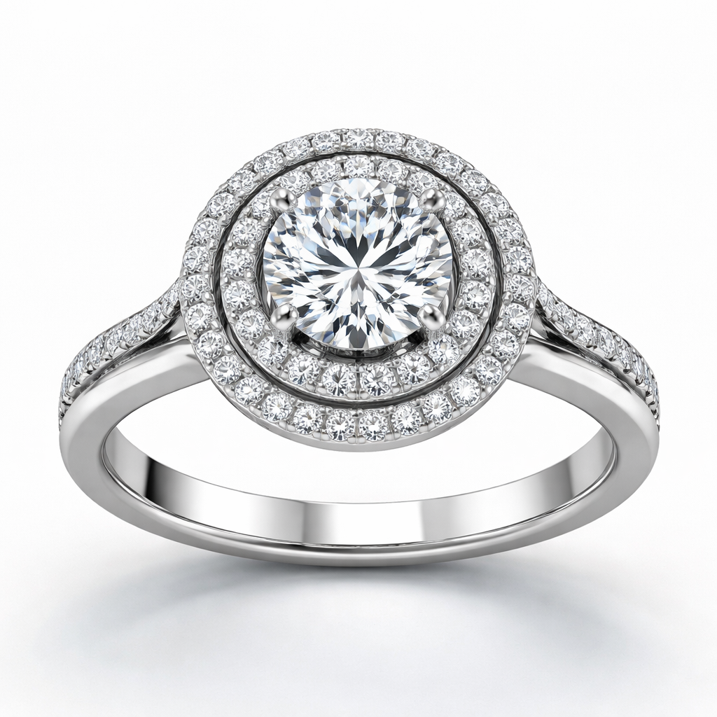 A women's ring. single round diamond with a double halo, modern style