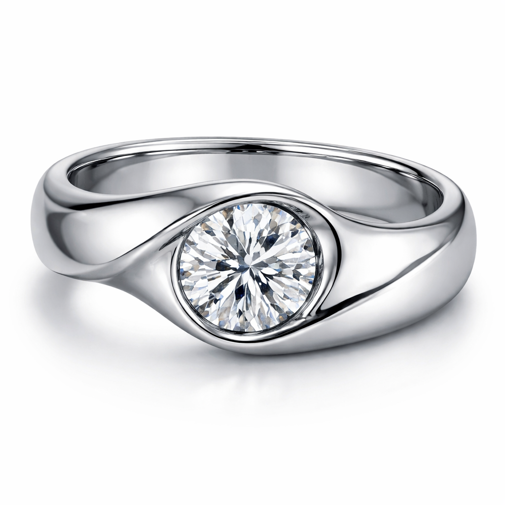 A modern women's ring made of platinum with diamond stones. diamond ring with a signet style look metal flowing up and around diamond in the round diamond shape with diamond set flush into ring, modern style