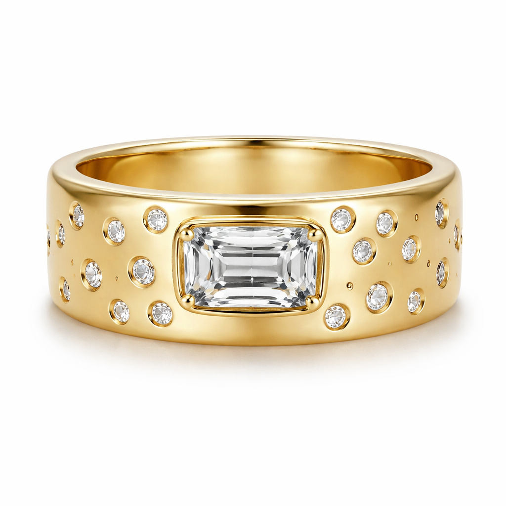 Thick gold band with one carat emerald cut diamond set horizontally with 20 small round diamonds scattered