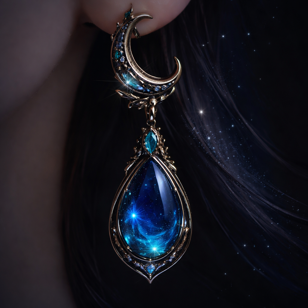 A women's ring. Ce bijou intitulé “Les Larmes de Nyx” s’inspire de la déesse grecque de la nuit. Il se compose d’un boucle d'oreille en métal fine et sombre, orné en forme de goutte, évoquant une larme lumineuse. La pierre d’un bleu profond et mystérieux, capte la lumière comme un fragment d’obscurité céleste. . L’ensemble crée un équilibre entre élégance nocturne, mystère et poésie. Forme (goutte, lune, boucle d'oreille…) Couleur (bleu profond, vert lumineux…) Inspiration (mythologie, nature, nuit…) Émotion (mystère, élégance, puissance…), modern style