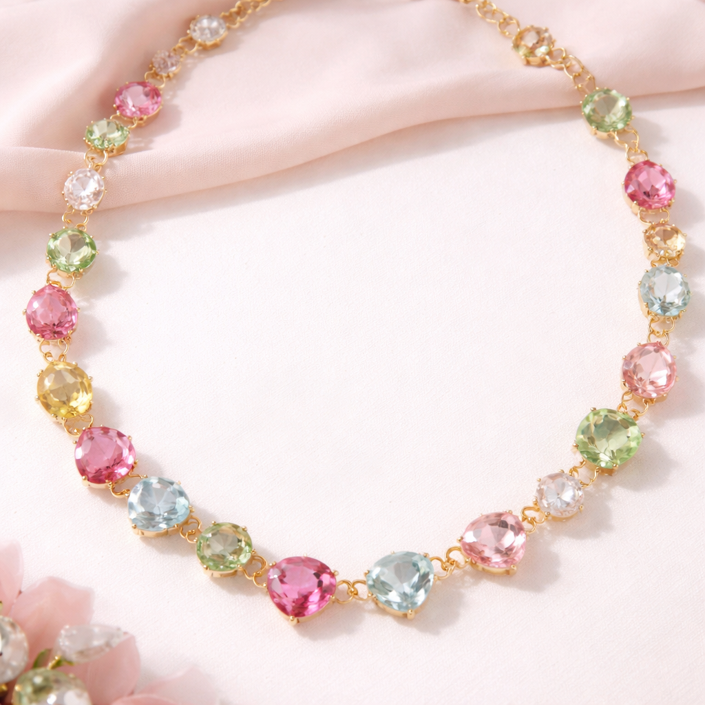 Gem stone necklace on a gold chain. Gem stones are connected throughout the entire chain. Different shapes and colors are light pink, hot pink, green, light blue, yellow, and white , romantic style