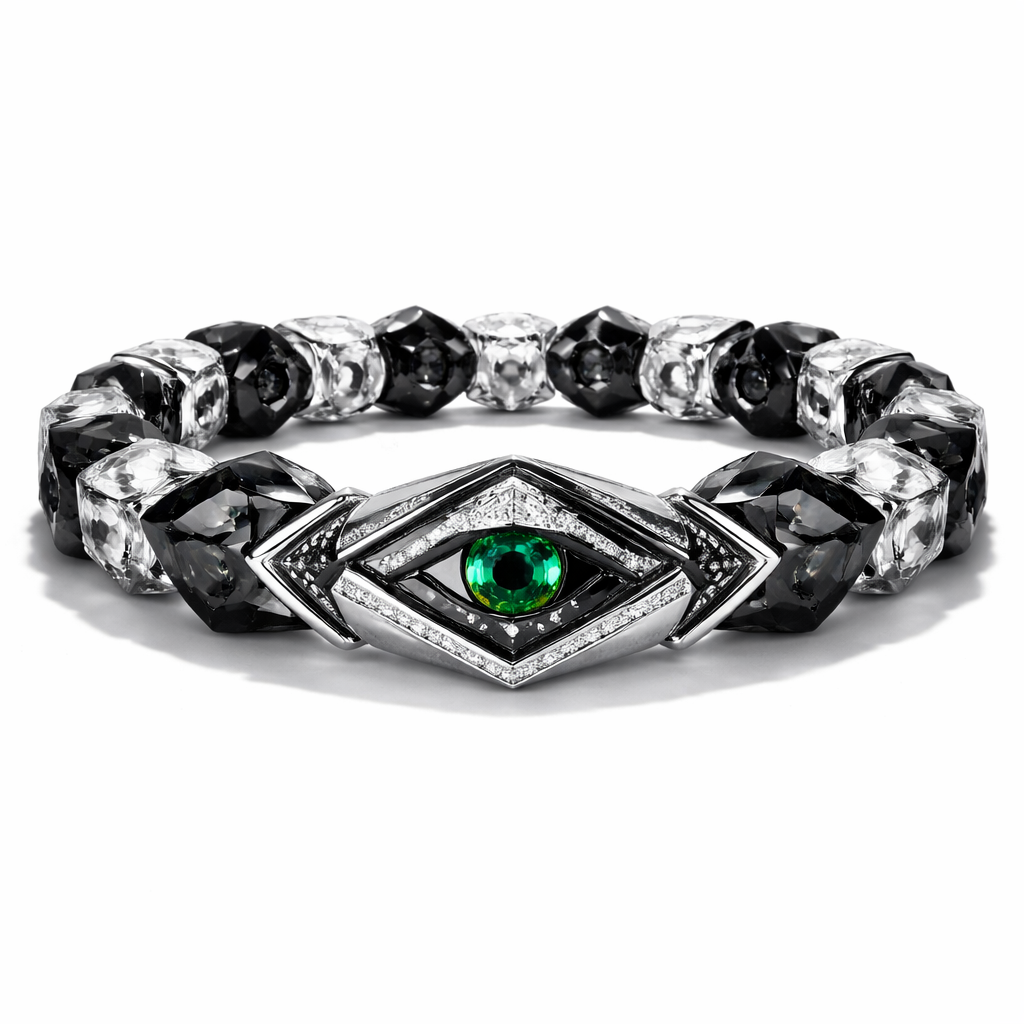 Geomatricw sharp edges of architectural shapes and design of bracelet beads for men of white and ablack diamonds adding eye shape in abstract and artistically way with white background adding eye artistic shape with green emerald
