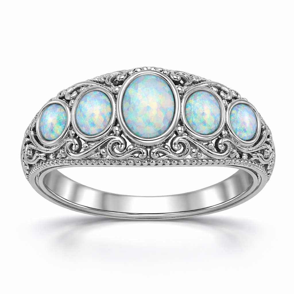 Five small oval opals bezel set on silver ring, filigree style