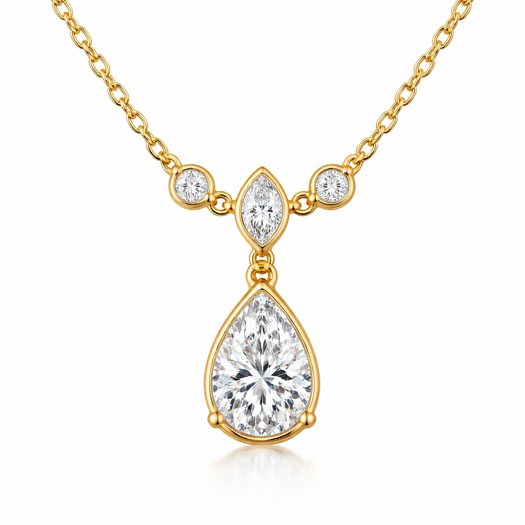 **Yellow gold necklace** with a pear diamond (0.56 ct, 6.80mm), a marquise diamond (0.23 ct, 2.80mm), and round diamonds (0.08 ct) in a bezel setting.