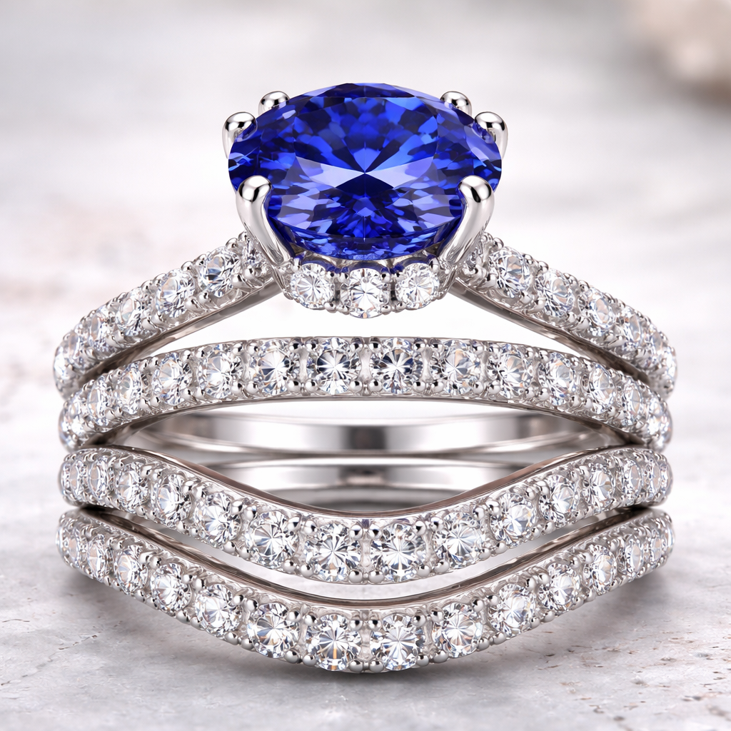 I want a 5-6 ct deep blue lab grown sapphire with no rail and hidden halo and 6 prong I want the center stone highly elevated and want moissiante going down the band and I want 3 matching wedding bands as a bridal set and the metal to be 10k white and make sure the center stone is highly elevated across all 3 bands