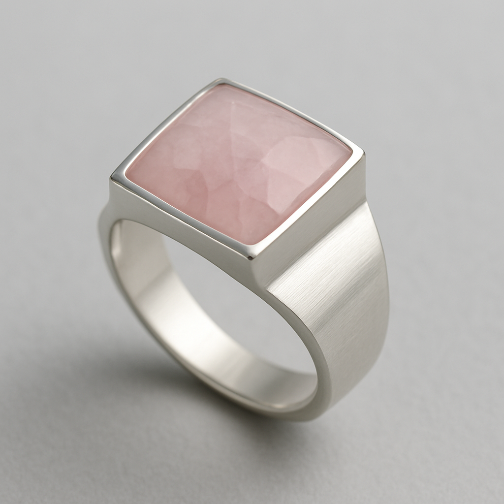 خاتم مربع من فضه بحجر كوارتز الوردي تصميم عصري