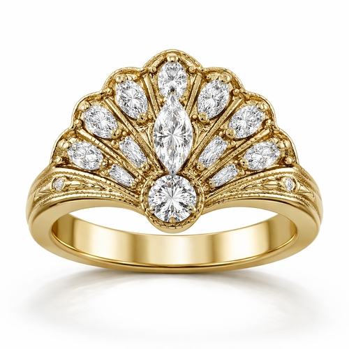 Create a fan style ring featuring a .6 marquise diamond in the center with a .25 carat round stone directly underneath s...