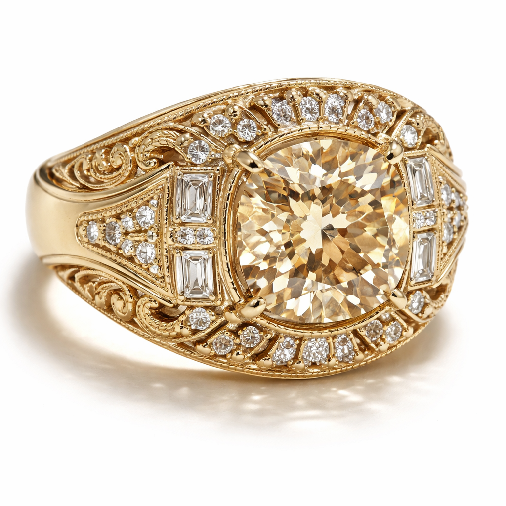 Old mine champagne diamond ring with broad band in light yellow gold , with vintage element , art_deco style