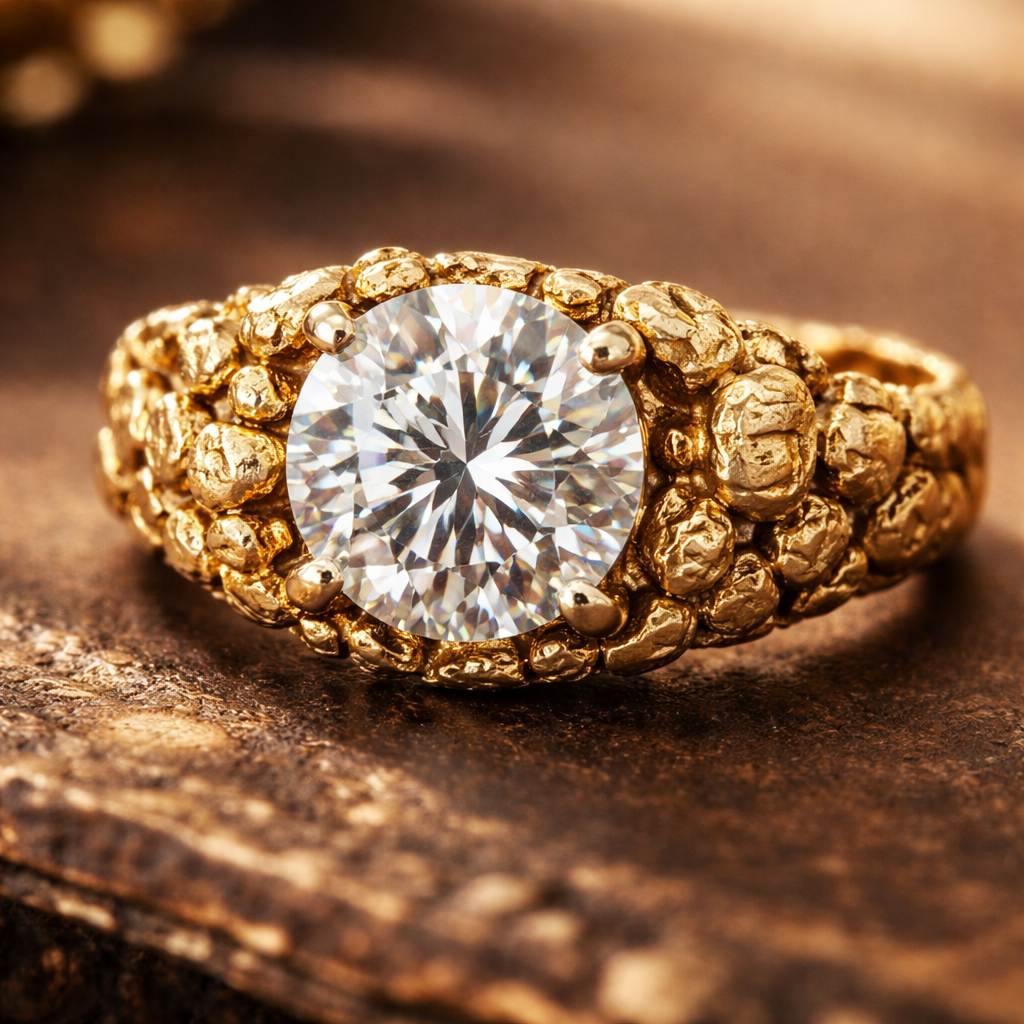Yellow gold nugget ring with a 3ct round brilliant diamond solitaire, vintage style