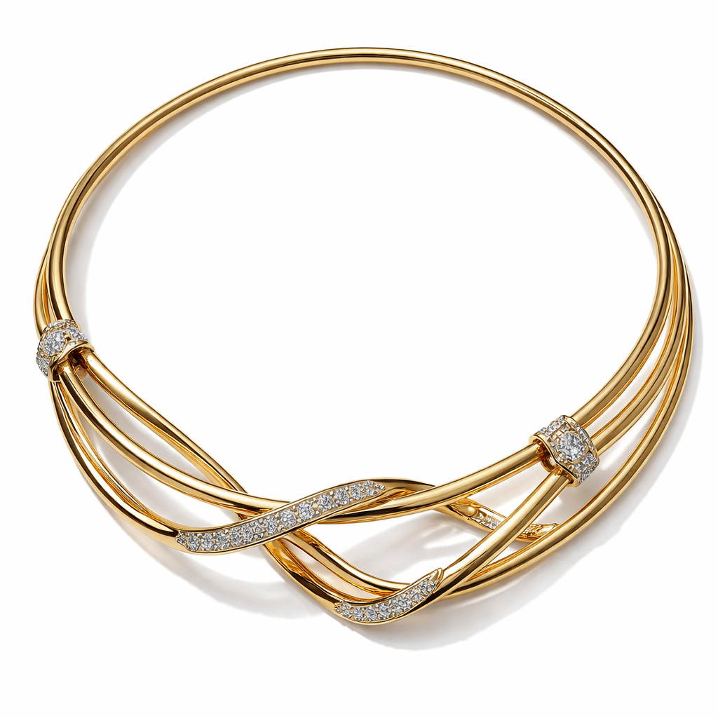 A necklace made of one flat wire that is twisted 3 times with links n articulations and gold n diamond, modern style