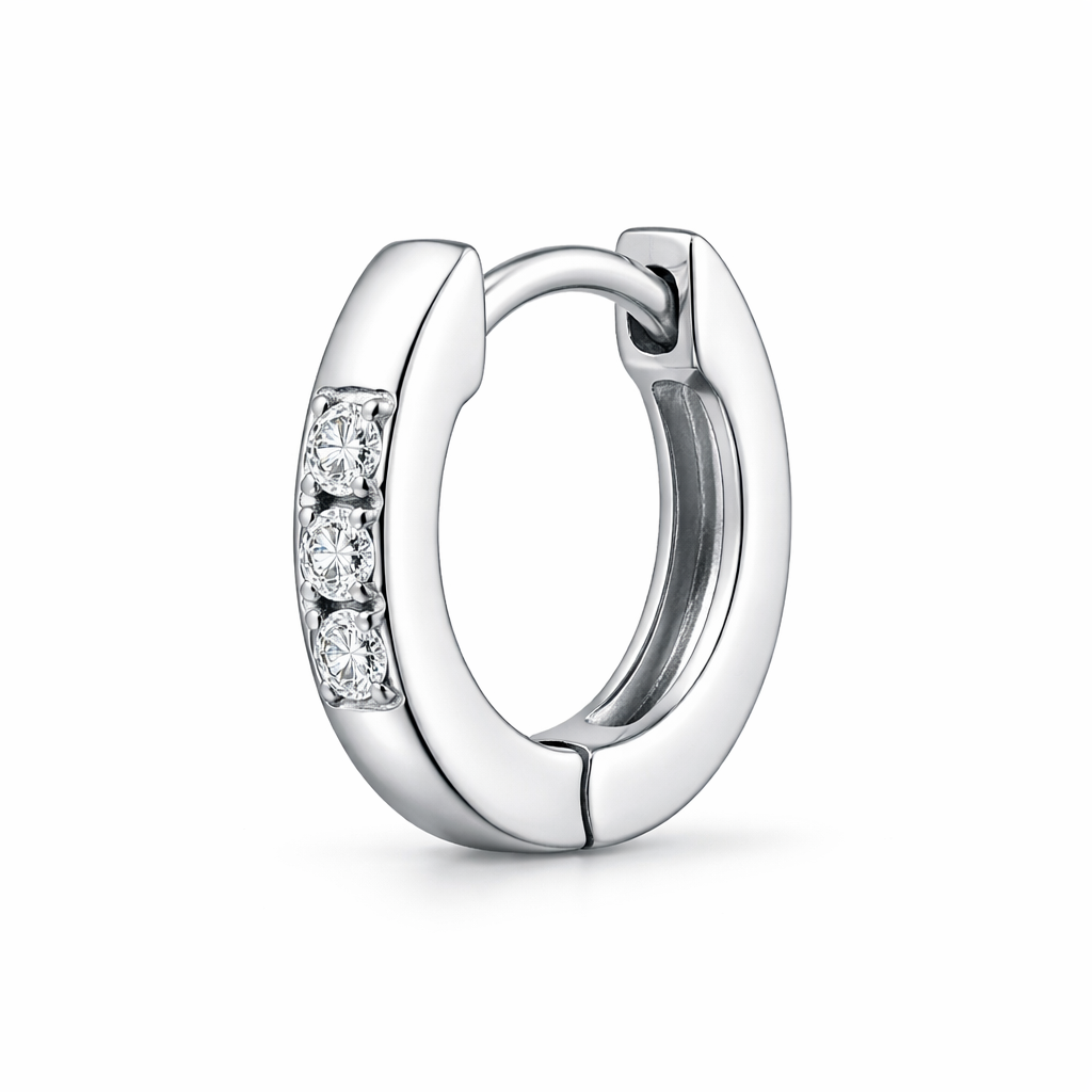 Make a white gold 10 mm in circumference Huggie pave set with just 3 small 1.5 mm round diamonds. Add one more diamond to the Pave setting. Change the diamond setting to be only three diamonds pave set